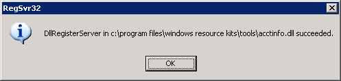 regsvr32 “C:\Program Files\Windows Resource Kits\Tools\Acctinfo.dll”