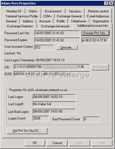 - the user account SID and GUID, and a button to see SID history (if the account has been migrated in from another domain)