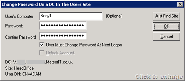 You can choose to just identify the site and tell you which DC it would use without actually setting the password by using the “Just find site” button. Be careful here – if you click “OK” instead and the password fields are empty, this will immediately reset the password to be blank, if that is allowed by your policy. If the password you give is not compliant with your domain policies it will not be permitted, you get an error and another chance.