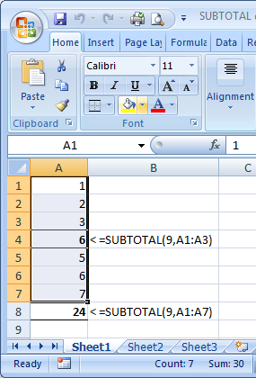 In Excel 2010 this behaviour has changed and these functions in the status bar ignore SUBTOTAL formulas in cells just like the function itself does, so the count shows 6 and the total 24. You can see the difference in the status bar of the two screenshots below, for Excel 2007 (left) and Excel 2010 (right) (click for larger images). The other features like Average and so on do the same, but I could not show too many at once on the same screenshot.