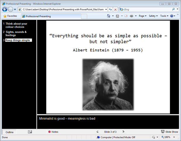 If you have a need to publish your presentation out to a web page, the titles of your slides will be used for the outline pane presented to the viewer for navigation, even if they would not be visible on the slides. In the short section of a recent training course presentation I have published and then viewed in Internet Explorer here, you can see the third slide has a title which makes sense for navigation (“Keep things simple”) rather than describing what is on the page (“Albert Einstein” would be a rather odd entry in the menu here). Omitting the title would have left a blank entry, which is not helping the audience at all.