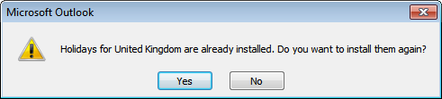 If you try to add the holidays for the same country more than once, you will get a prompt like the one below to check if you really want to do this. If you know you only have a special subset list to add, or you have deleted the ones you already installed, you can safely say yes to this, otherwise say no to avoid any duplication.