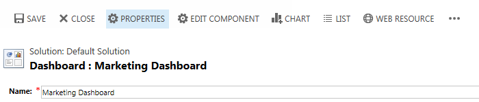 With CRM 2013 there was a big change – although you could change the name of a dashboard, there was no “Properties” button on the command bar to change the description, so if you got it wrong when you first created and saved it – tough, you could not go back and fix it later. And “Dashboard” is not an entity you can add to a Solution to work on the command bar RibbonXML using Ribbon Workbench, for example.